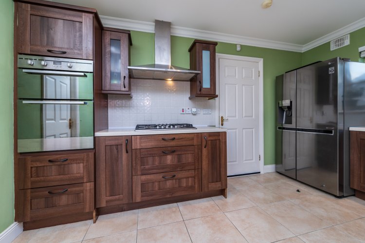built in ground and eye level presses, breakfast bar, recessed lights, coving, s.s. sink unit, 5 ring gas hob, extractor, electric double oven, French doors to rear garden, tiled floor and surround. |