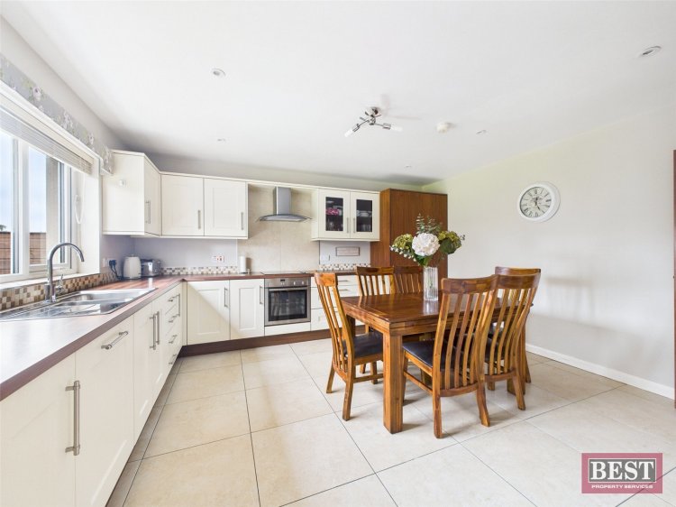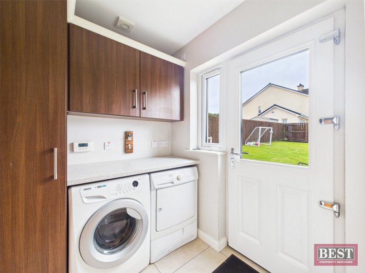 Internally the property consists of on the Ground Floor a bright spacious Entrance Hall with tiled flooring. The Lounge is located to the front of the property and has laminate flooring and feature fireplace with electric fire inset and recessed lighting. The Kitchen/Dining Area is to the rear of the property and has a range of modern upper and lower level units with integrated appliances included. The Utility Room is adjacent to the Kitchen and has a range of units and is plumbed for a washing machine and tumble drier with access to the rear garden. There is also a Separate W.C. on this level.
