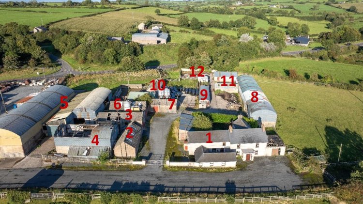 Yard Description 1. Former 3 bed detached farmhouse 2. Calf boxes 3. Former Herringbone Parlour 4. Slatted shed 5. 4 link Self-feed silo with 3 link lean too shed, adjacent 2 link cubicle shed (Approx 57 cubicle spaces) 6. Calf boxes 7. Traditional outbuilding 8. 7 link solid floored shed 9. Traditional outbuilding 10. Pig housing 11. Pig housing 12. Concrete yard area As per the Dard map- At the corner of field 12 there is a useful cattle crush.