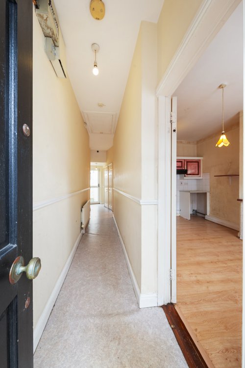 Entrance hall     7.73m x 0.84m Linoleum flooring.  Access to attic.  Door to hot press. Door to storage cupboard.