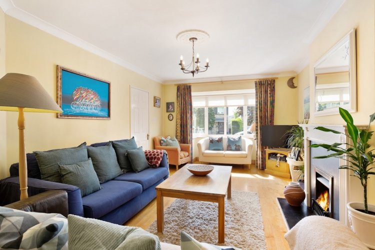 Living Room: 5.75m x 3.57m, with feature fireplace fitted with gas fire, timber flooring, bay window overlooking front garden aspect, ceiling coving, double doors to dining room.