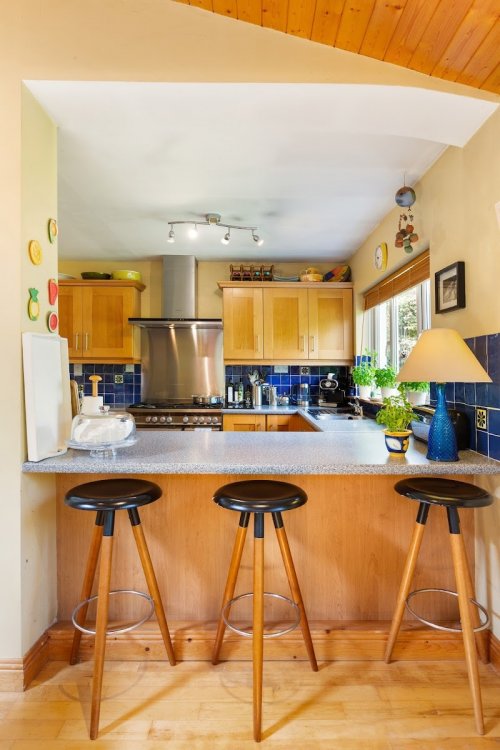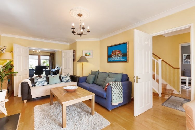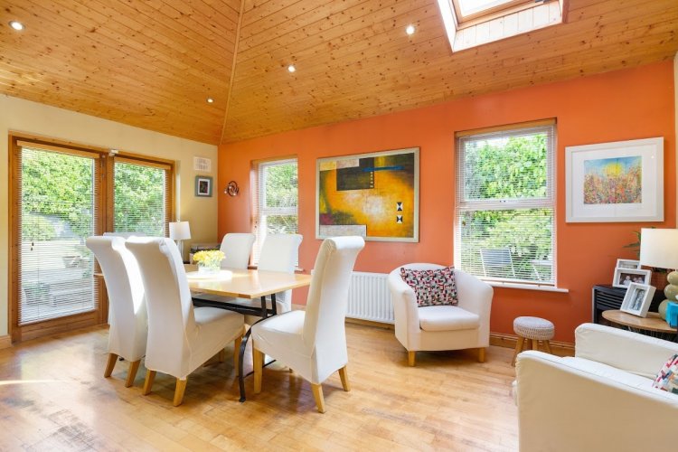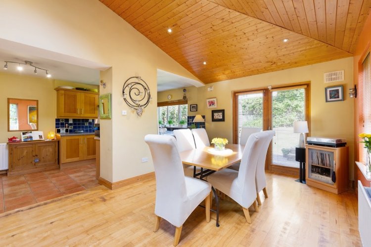 kitchen opening to large bright extension overlooking garden and patio area with panelled ceiling and Velux window, feature windows and French doors opening to rear garden, recessed lighting.