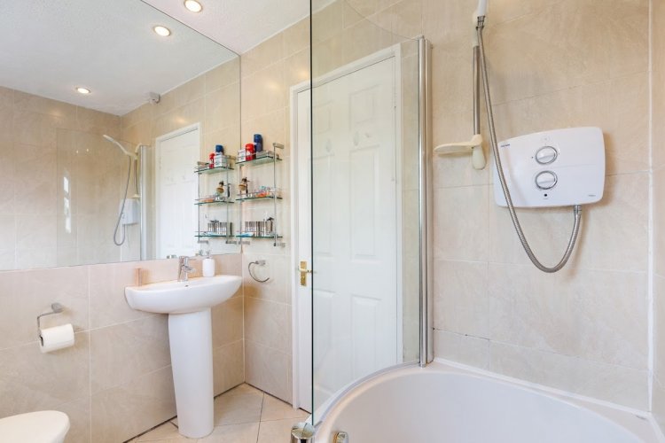 Bathroom: large bathroom with white suite comprising larger bath, separate Triton electric shower, wash hand basin, wc, ceramic tiled walls and floor, window to side aspect