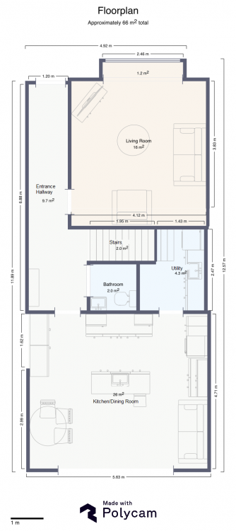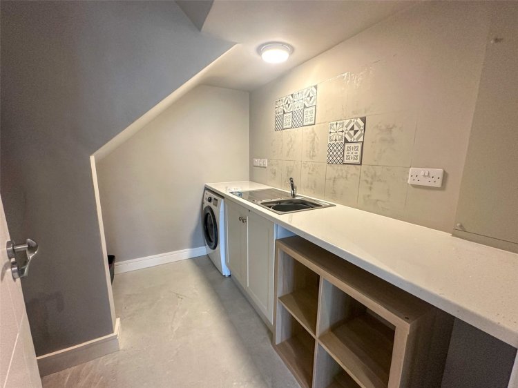 The ground floor consists of a large living room to the front, guest bathroom, a spacious open-plan kitchen-dining area with central island countertop and a separate utility space.