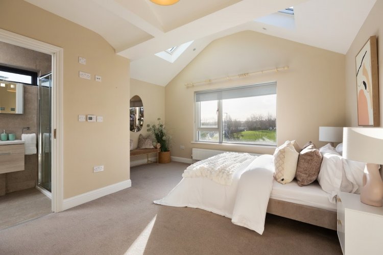 Master Bedroom: 4.47m x 4.23m forms part of the extension area and set out to rear aspect with a large window and feature vaulted ceiling comprising 2 velux windows, carpet flooring, door to