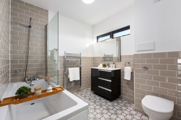 Bathroom: 3.18m x 3.12m, with fully tiled walls and floor and featuring a white bathroom suite comprising bath with shower over, glass shower panel, wash hand basin, wc, fitted vanity mirror with lighting, recessed lighting and window to side aspect (underfloor heating)