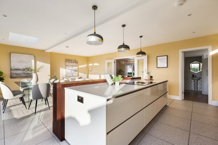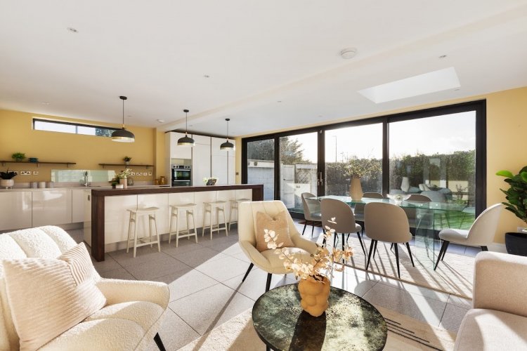 Kitchen/Dining/Family Room : 7.87m x 5.52m overall with fitted Kube kitchen, feature double glazed floor to ceiling doors opening to garden and roof window panel bringing in natural light, tiled floor, four door bay of sliding doors opening to sun terrace and landscaped gardens