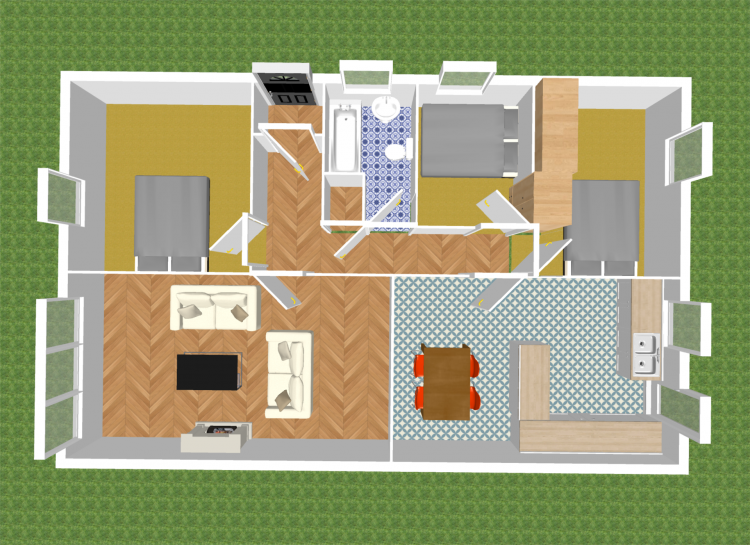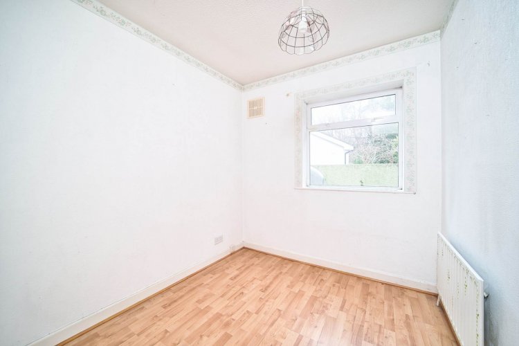 Bedroom 3 (Rear) 2.4m x 2.3m Laminate flooring and hanging pendant light with shades.