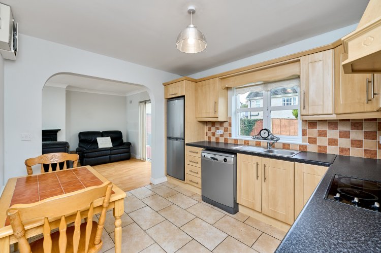 great dual aspect front living room with ceiling coving, laminate wood flooring, open fireplace, patio doors to the large westerly rear garden curtains/blinds included. Open plan to the kitchen/dining room