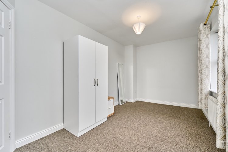 Rear double bedroom with carpet flooring, curtains included