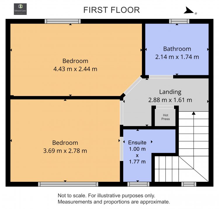 With carpet flooring, hot press & access to attic