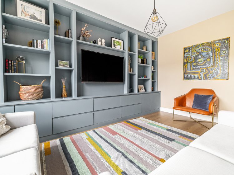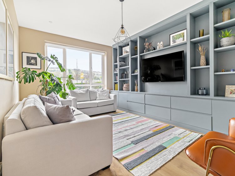Sitting room: 4.70m x 3.30m DG, full-height windows to front aspect, laminate flooring and a range of built-in storage and display units.