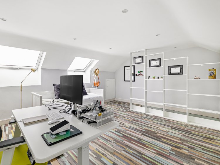 Attic room: 5.40m x 4.40m Twin, DG Velux windows to rear aspect, laminte flooring, eaves storage and spot-lighting.