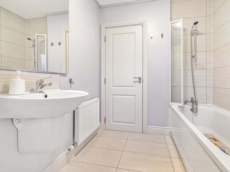 Bathroom: 2.40m x 2.00m DG, frosted glass windows to front aspect, tiled flooring, bath with shower over and splash-screen, hand basin and W.C.