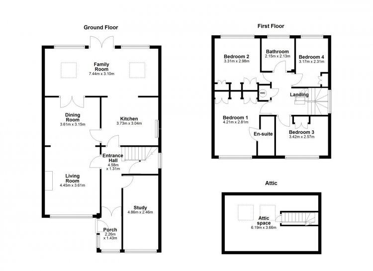 Upstairs, there are four well-proportioned bedrooms, including a generous main bedroom with en suite, together with a family bathroom. A further flight of stairs leads to the attic room, which provides valuable additional space suitable for a variety of uses.