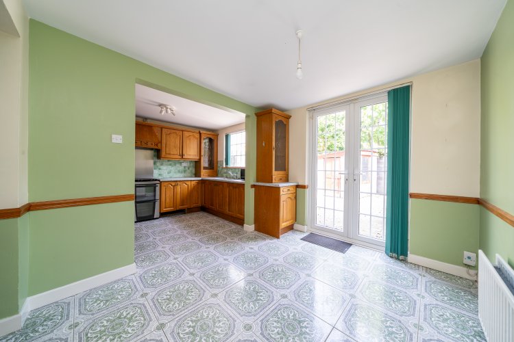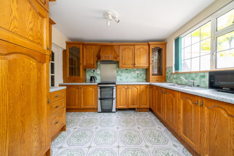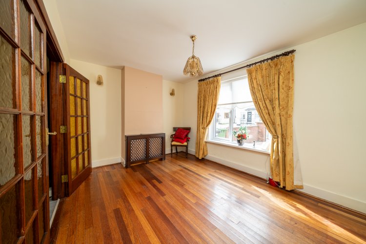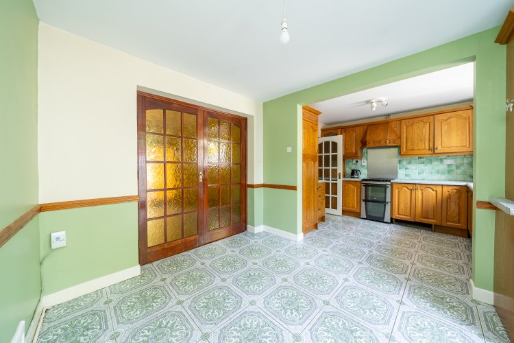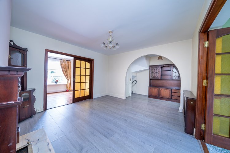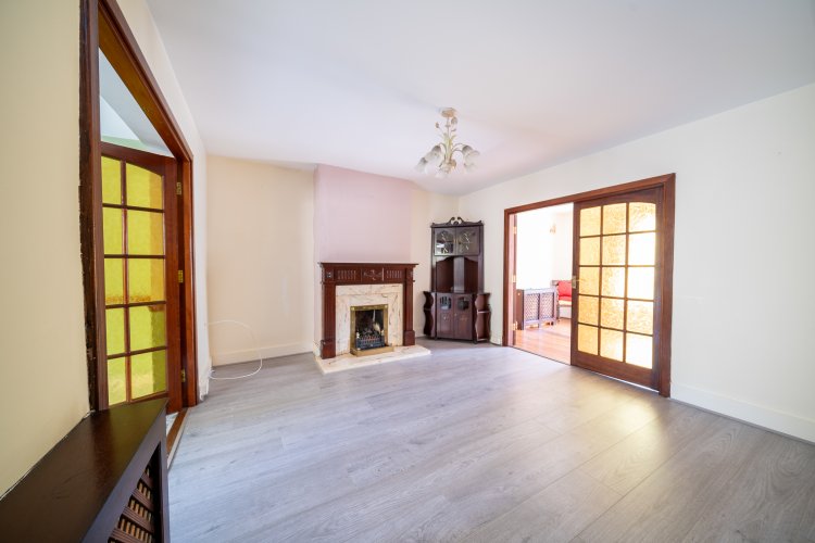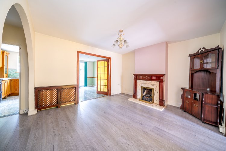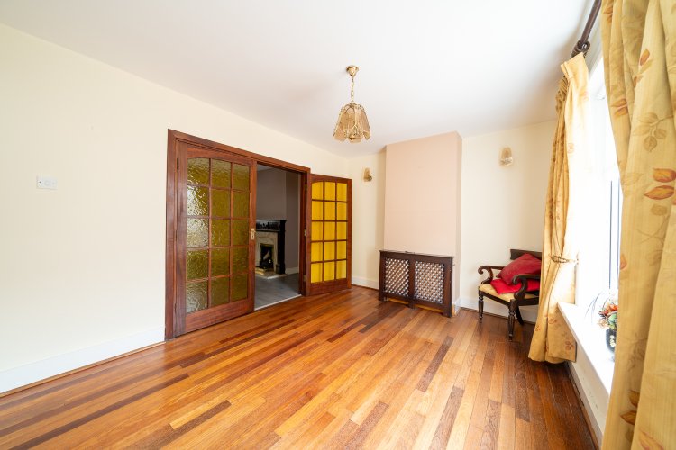 This charming property features a cobblelock gated driveway leading to an eye catching facade and a storm porch with sliding doors. The entrance hall comes with a tiled floor and a radiator cover. To the right of the hall is a light filled living room with laminate floors and a large south west facing window overlooking the driveway. Double doors from the living room open to a spacious dining area with laminate floors, a gas fireplace and an attractive archway leading to the hallway and a space which could make an ideal home office. A second set of stained glass double doors open to the kitchen extension which can also be accessed from the hall. The L shaped kitchen boasts a tiled floor, splashback tiling and plenty of counter & cupboard space and has lots of space for a breakfast area. The sunny cobblelock garden is accessed through double doors from the kitchen and incorporates a purpose built storage shed.