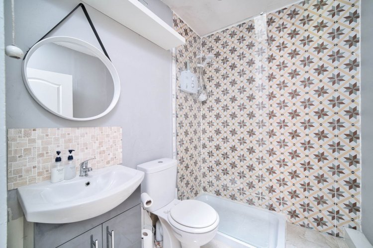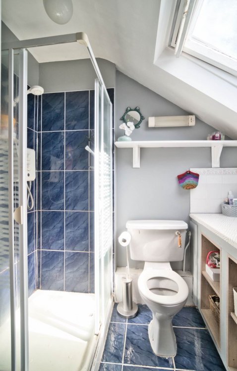 Ensuite 1.38m x 2.07m Tiled flooring, shower cubicle with Triton shower, w.c., w.h.b., storage, light fitting and Velux window.