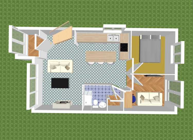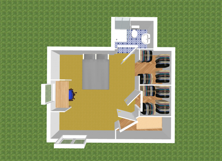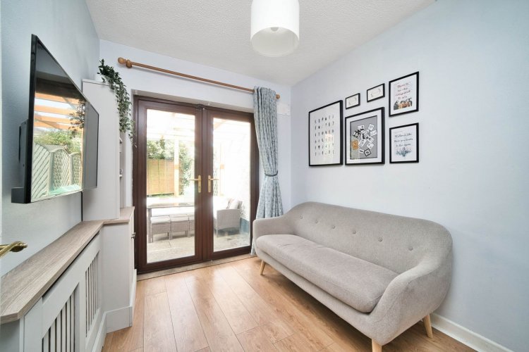 Bedroom 3/ Study 3.34m x 2.33m Laminate flooring, light shade, curtains, blinds and double doors leading to rear garden.