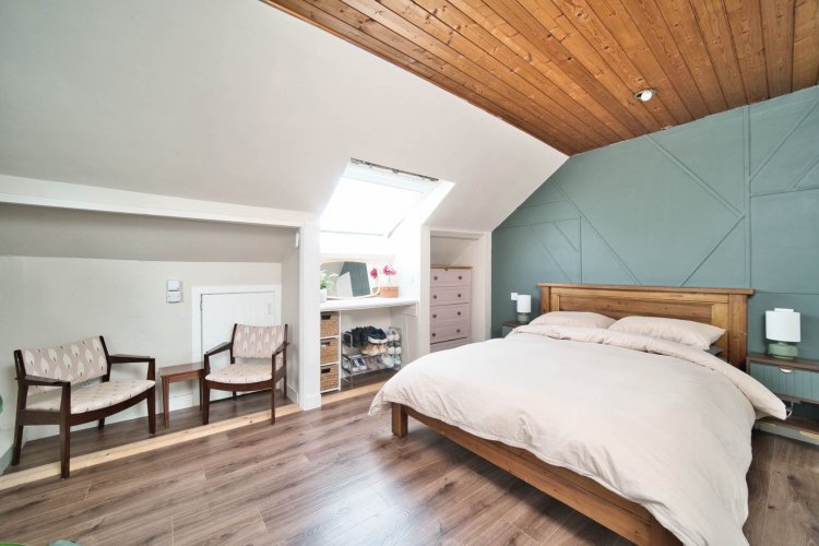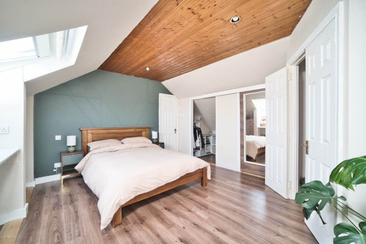Landing 4.31m x 5.73m Master Bedroom Laminate flooring, fitted wardrobes, recessed lights, feature wall with wood mouldings, access to eaves storage, full side window and Velux window.