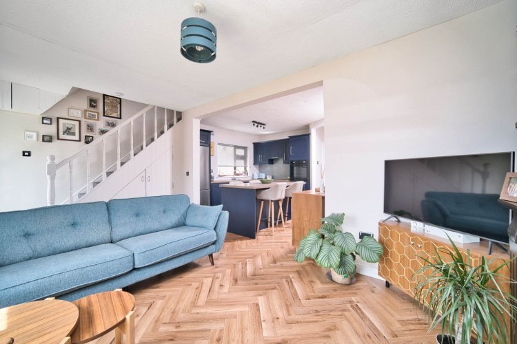 Living Room 5.68m x 3.1m Open-plan layout into kitchen area. Laminate wood flooring, under stair storage, fireplace with gas fire insert, blinds, curtains and light shade.