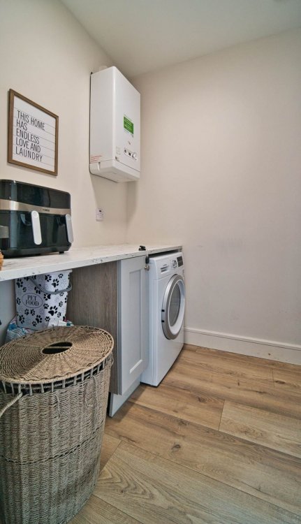 Utility Room 3.61m x 1m Semi solid flooring, storage units, fully plumbed for washing machine, houses gas boiler and light fitting.
