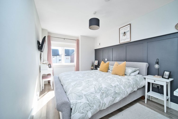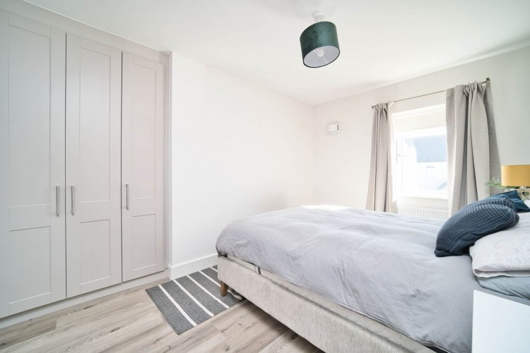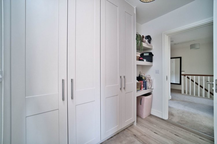 Master Bedroom 4.85m x 2.84m Semi solid flooring, fitted wardrobes, integrated shelving, wall panelling, blinds and light fitting.