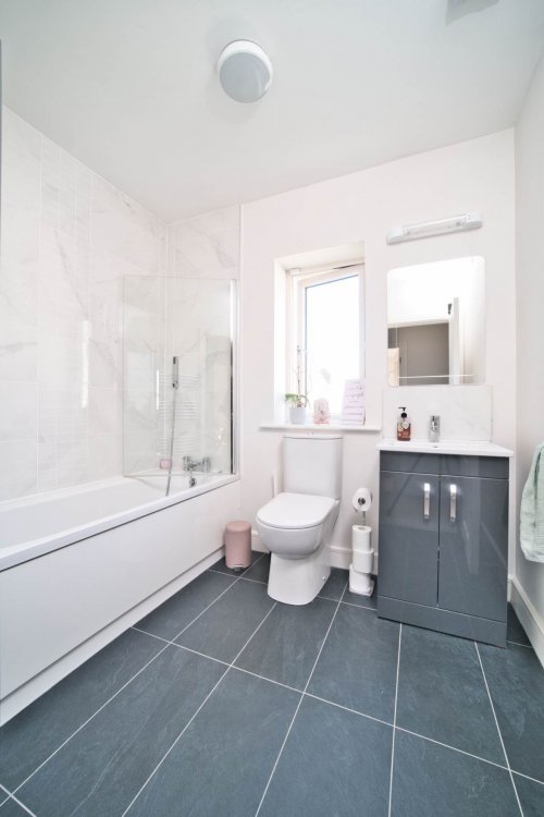 Bathroom 2.29m x 2.34m Tiled flooring, semi tiled wals, bath with shower screen, w.c., w.h.b. with built in vanity unit, mirror with shaving ight, heated towel rail, extractor fan and light fititng.