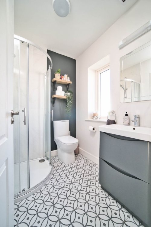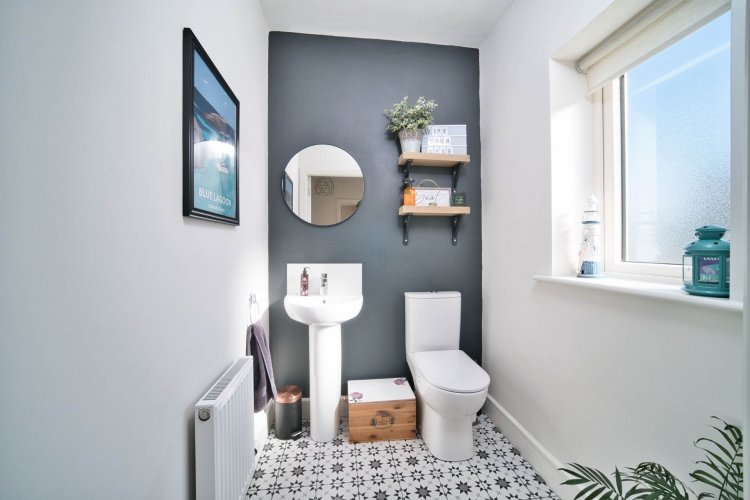 Guest W.C. 1.76m x 1.76m Tiled flooring, w.c, w.h.b., integrated shelving, window with roller blind and light fitting.