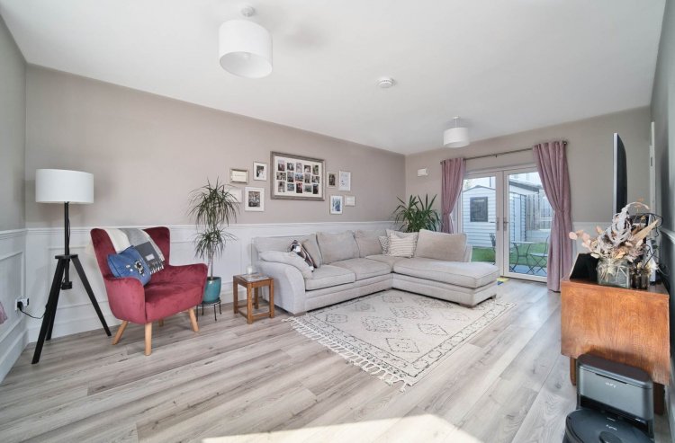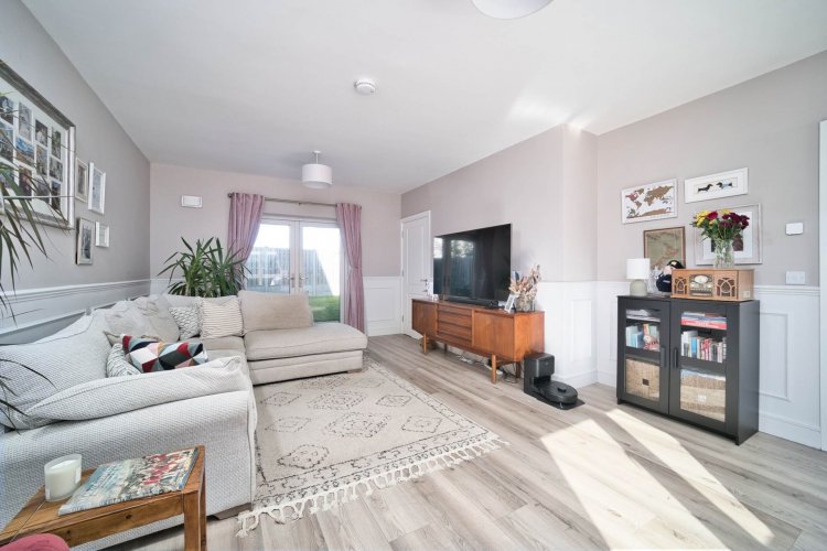 Living Room 3.77m x 6.72m Semi solid flooring, wall panelling, window seat with storage, light fitting, TV point, blinds and French doors leading onto rear garden.