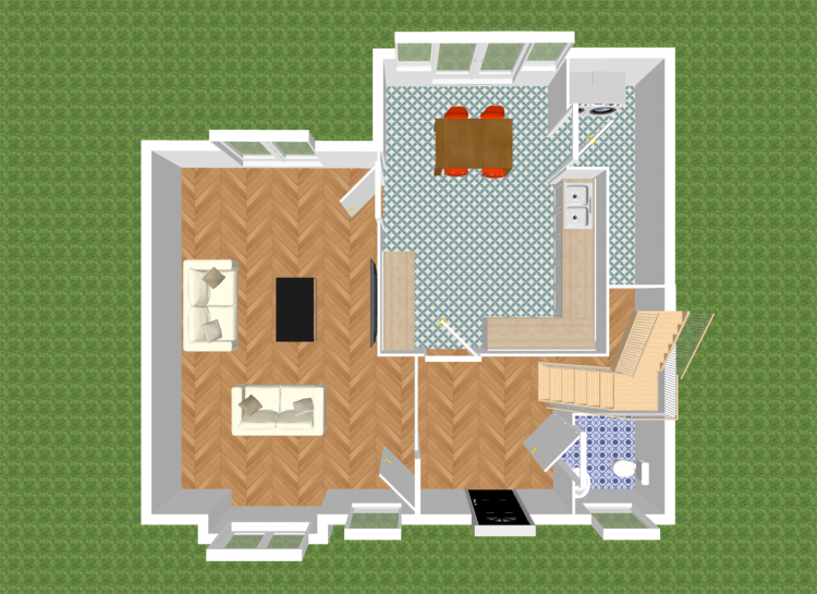 Kitchen/Dining 5m x 3.71m Semi solid flooring, fitted wall and floor units, worktop with upstands, stainless steel sink, integrated oven, induction hob, extractor fan, fridge freezer, dishwasher, integrated lighting, blinds and double French doors leading onto patio area.