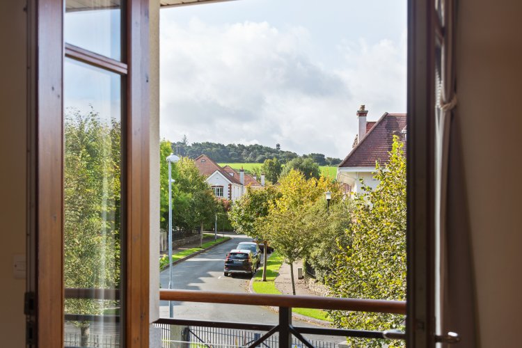 The accommodation includes entrance hall, open plan living room to front and opening to kitchen, door to south facing sun balcony overlooking front with south facing views, there are two double bedrooms and main bathroom as well as storage room off hallway.