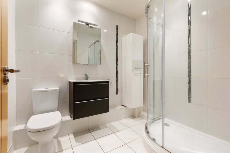 Shower Room: 2.33m x 1.93m with fully tiled step-in shower, tiled walls, wc and wall mounted vanity wash hand basin with under sink storage, splashback, fitted vanity unit with mirrored door, wall mounted vanity unit, recessed lighting, tiled floor, heated towel rail.