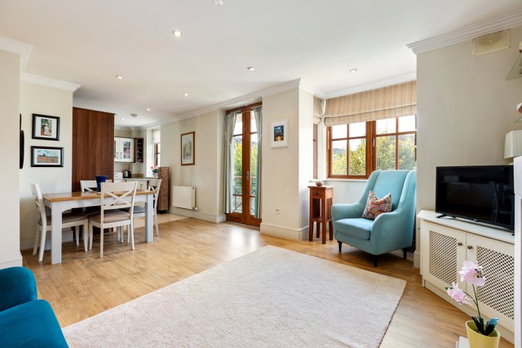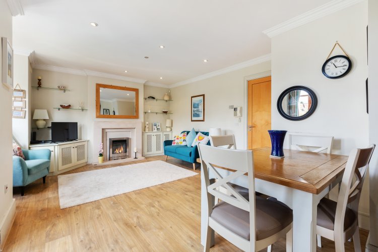 Open Plan Living Room/Dining Room: 7.95m x 4.41m overall, with oak timber flooring, feature solid stone fireplace with fitted coal effect gas fire, audio/visual security intercom, recessed lighting, tv point, ceiling cornicing , French door to private sun balcony