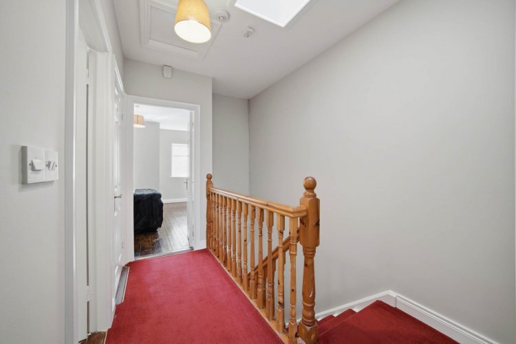 Landing 2.00m x 2.80m Fully carpeted including hardwood stairs, access to attic, Velux skylight.
