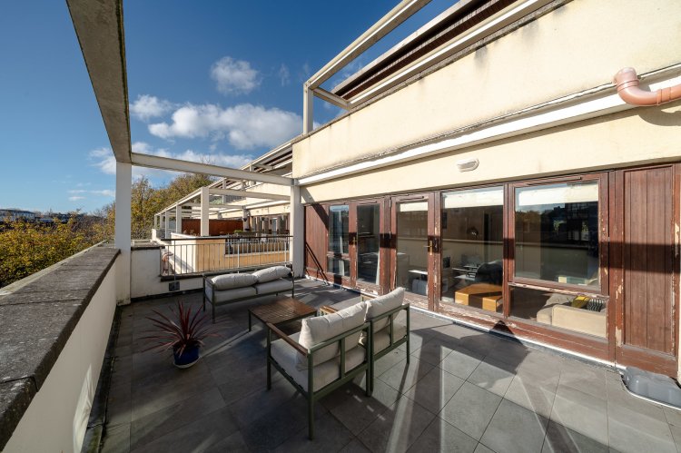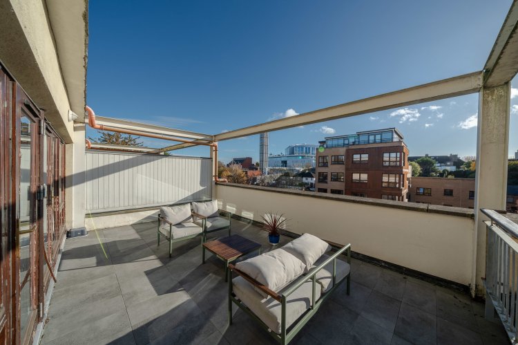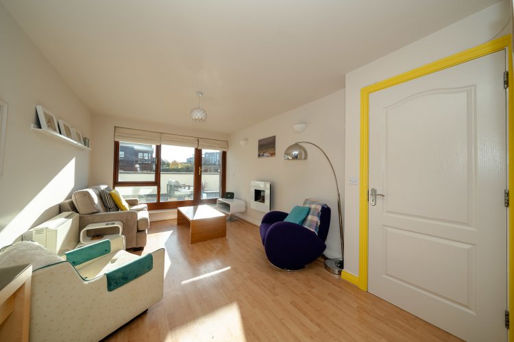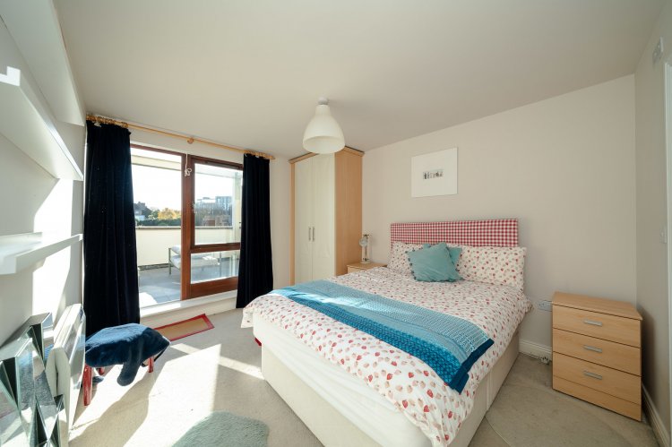 Exceptional two bedroom open plan dual aspect apartment with own door access and a large south facing terrace overlooking The River Camac.