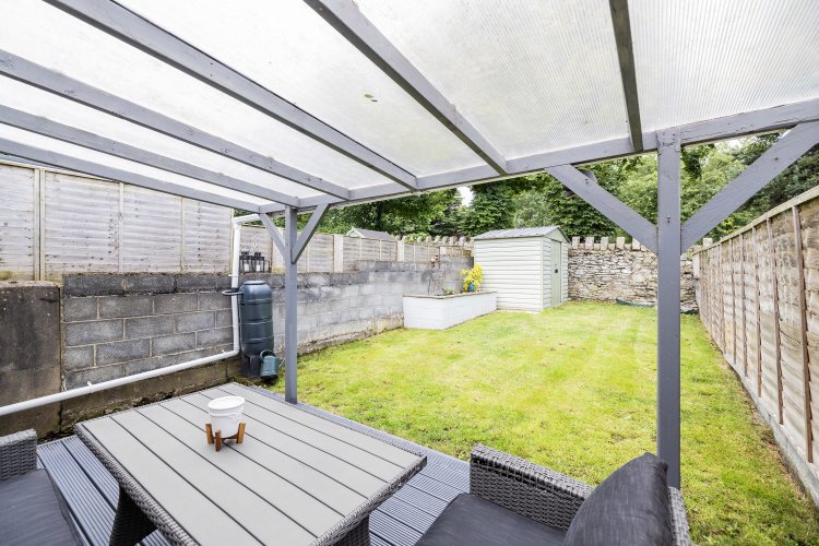The rear of the property is ideal for summer BBQs with a covered decked area, and the original dry stone wall at the end of the garden adds a touch of elegance and character to the outdoor space.