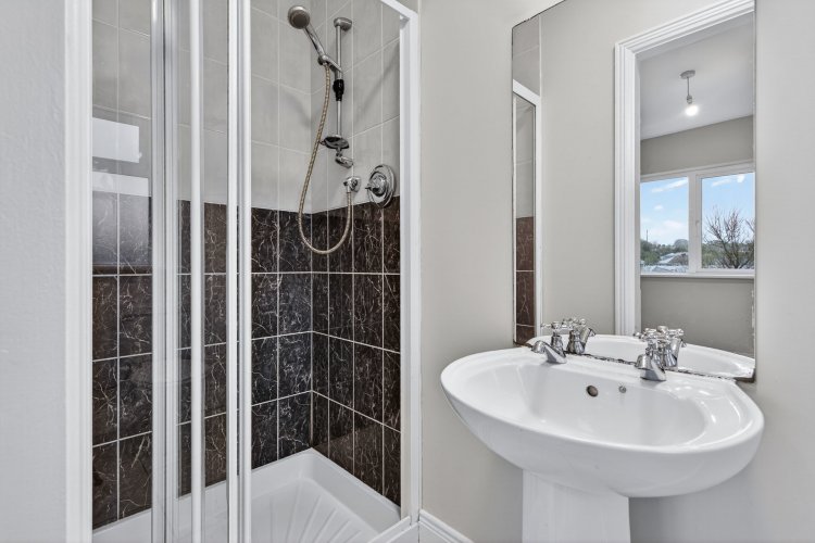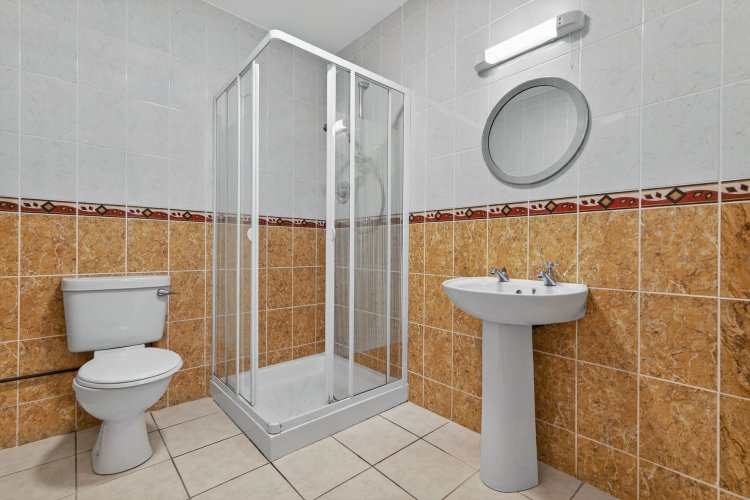 With tiled flooring, toilet, wash hand basin and shower and is fully tiled around the shower area. It is a generous sized shower.