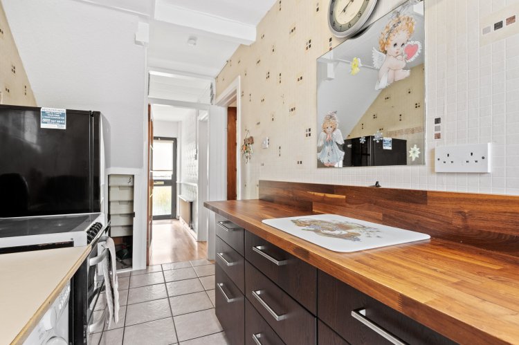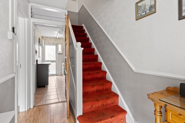 The ground floor provides separate living and dining rooms, allowing flexibility for entertaining, familylife, or working from home. A fitted kitchen sits to the rear, while the entrance hallway connects the spaces and provides access to the staircase and additional storage.