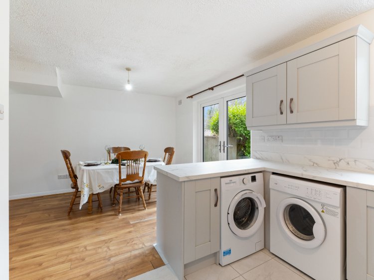 This is entirely open plan with a newly fitted kitchen complete with new appliances to include integrated dishwasher, dryer and washing machine. There is an oven, hob, fridge freezer and magnificent standard of finish with a beautifully tiled back splash. The dining area has laminate wood flooring and newly fitted triple glazed french doors opening out onto the rear garden area.