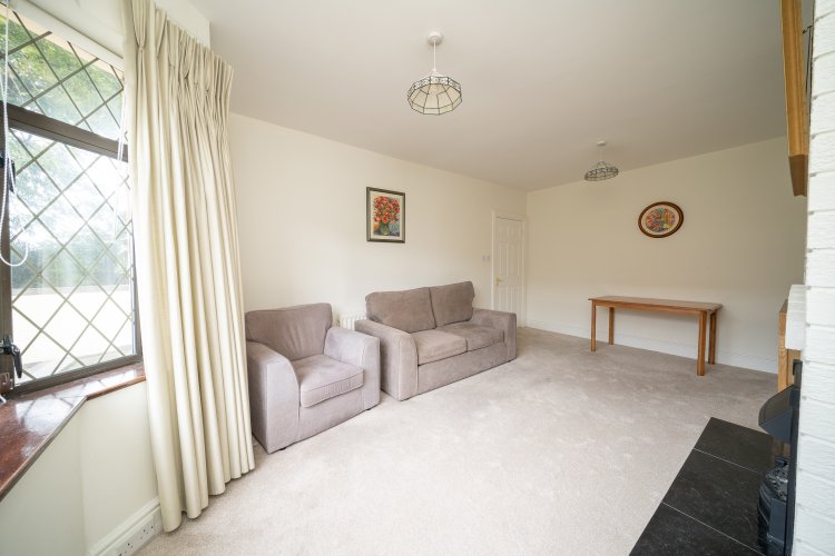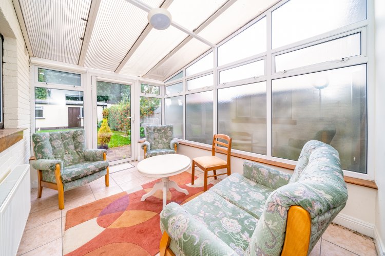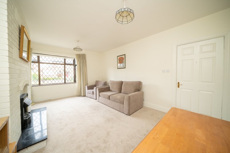 This exceptional property features a gated driveway, front garden and an attractive partial red brick facade. A storm porch with a checkered tiled floor opens to the entrance hall through a stained glass door. The hallway comes with comfy carpet and a guest w.c. with a tiled floor. To the right of the hall is a spacious living room with carpet and an electric fireplace with a brick surround.