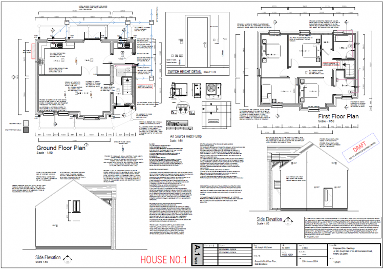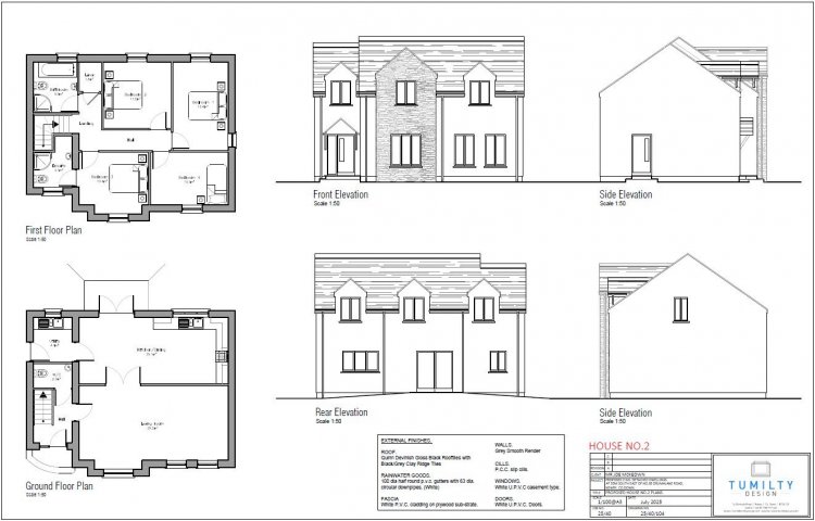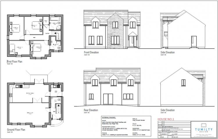 Specification: • Painted internal walls and ceilings. • Architraves and skirting boards in painted finish • Bright and spacious entrance hallway • Generous range of electrical sockets and switches • Lighting to combine a mix of recessed LED spot lighting and pendant lighting. • Mains Supply smoke, heat, and carbon monoxide detectors with Battery backup • Solid internal doors. • Wired for security alarm • High quality Kitchen & Utility units fitted. (From nominated suppliers) • Sanitary Ware (From nominated suppliers) • Wall tiling within shower areas, and over sinks (From nominated suppliers) • Quality Carpets/laminated flooring (From nominated suppliers) • Energy efficient Air source heating system • Double Glazed Pvc windows External sensor lighting. • Tarmac Driveway • Stone wall to road boundary. Gardens to the side and rear top soiled and seeded.