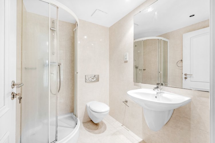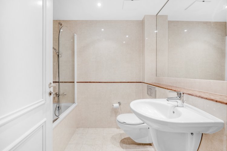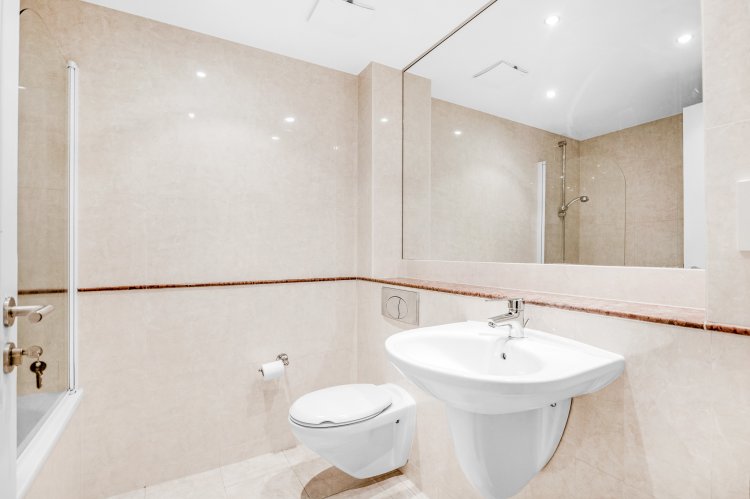 Bathroom Tiled floor and walls, wall mounted sink, bath, bath screen, wall hung w.c, granite shelf, mirror, recessed lighting, extractor fan.