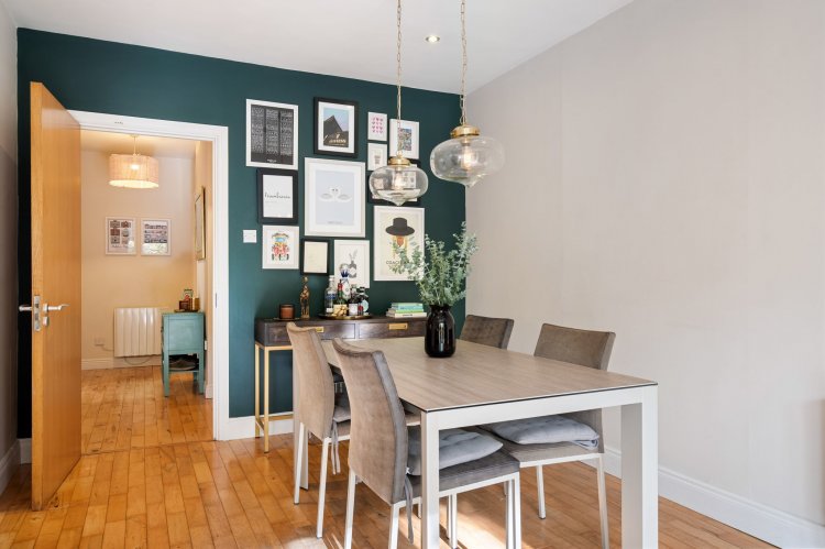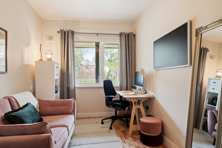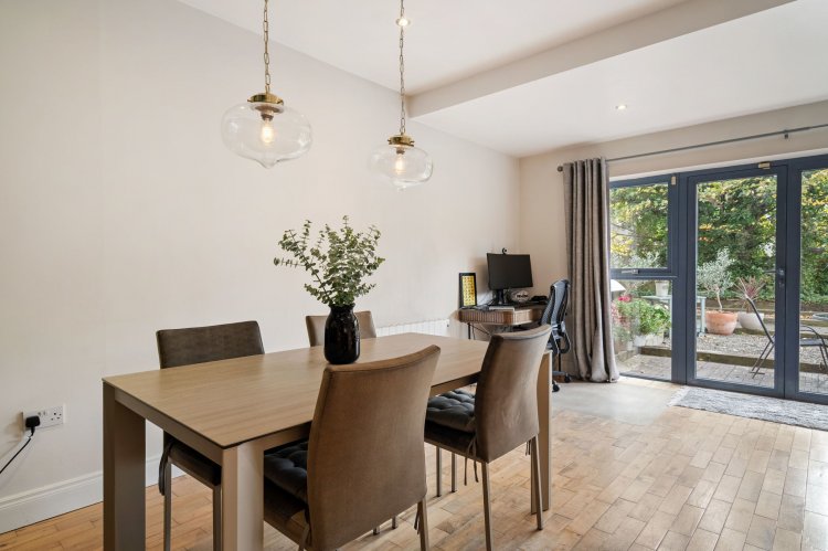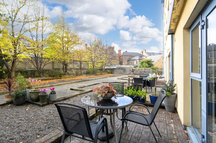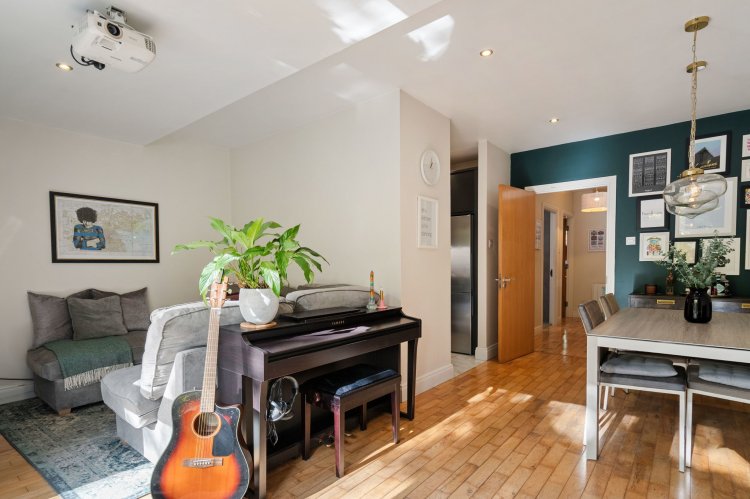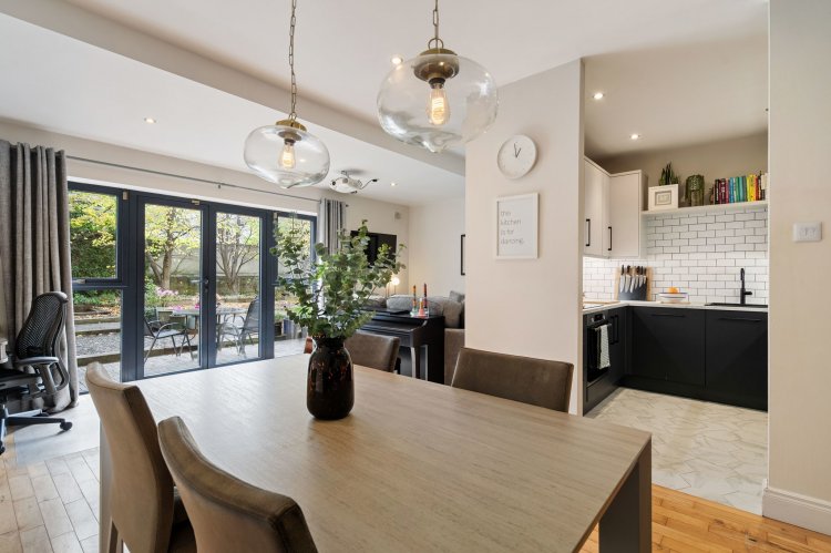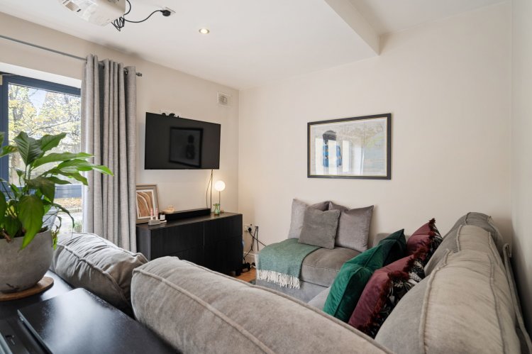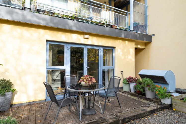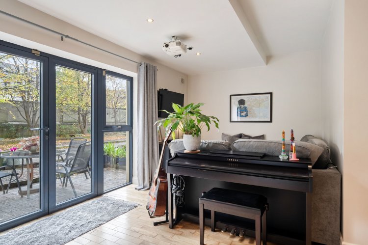 South-facing to the rear, the living and dining area is bathed in natural light, with French doors opening onto a private patio — perfect for morning coffee or summer barbecues. The apartment combines modern style with a warm, homely atmosphere throughout.