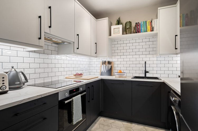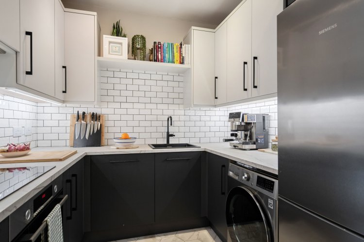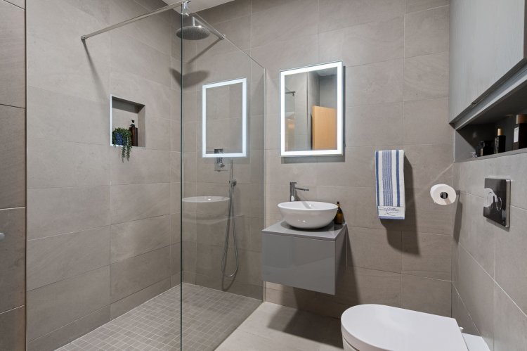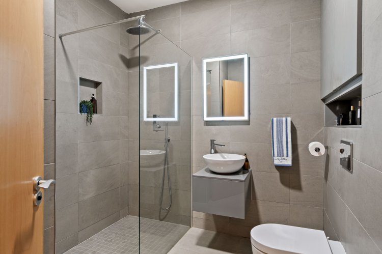 The bathroom features a contemporary design with a walk-in shower, smart storage, and an LED mirror light. The kitchen, remodelled just two years ago, boasts a chic brick-style tile finish, modern appliances, and ample storage.