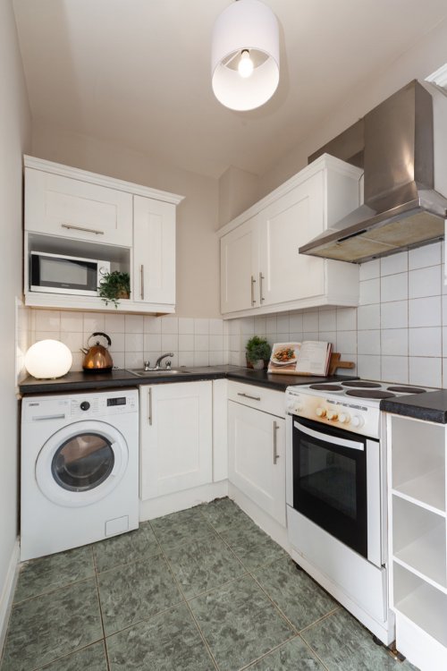 Kitchen     2.58m x 1.82m Tiled flooring. Range of wall and floor units. Tiled splashback. Extractor fan. Plumbing for washing machine.