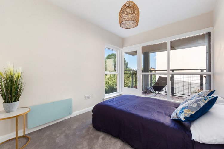 Bedroom 1 3.7m * 2.87m Laminate wood floors. Built in wardrobes. Door to balcony.
