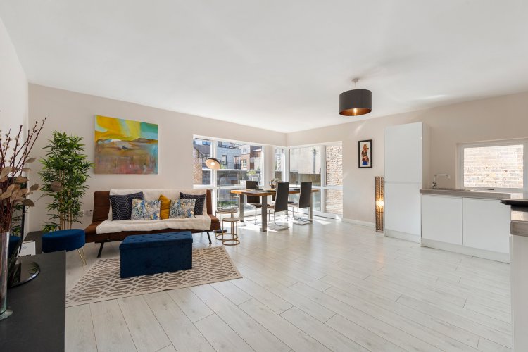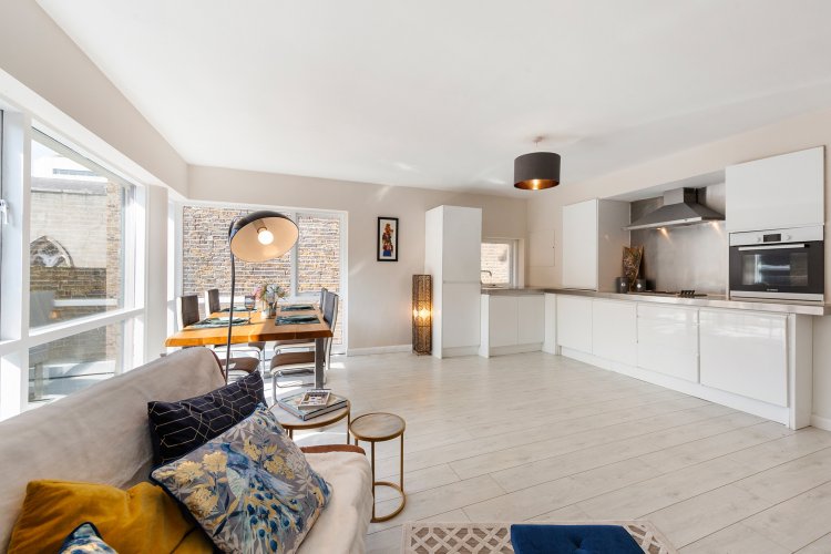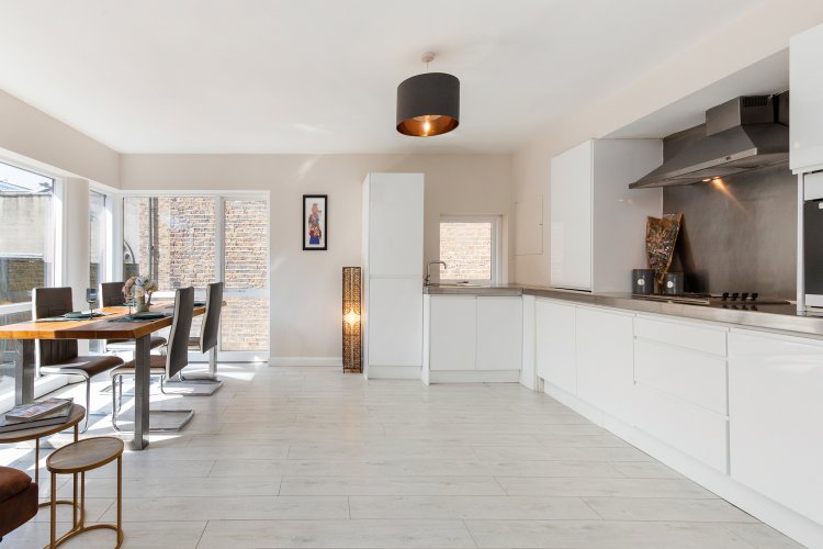 Kitchen/Living/Dining 5.6m * 5.6m Laminate wood floor. Integrated shelving. TV point. Phone point. Fitted high gloss kitchen units with stainless steel worktops. 4 ring electric hob. Bosch electric oven. Extractor fan. Stainless steel sink unit. Plumbed for dishwasher. Plumbed for washing machine. Integrated fridge freezer.
