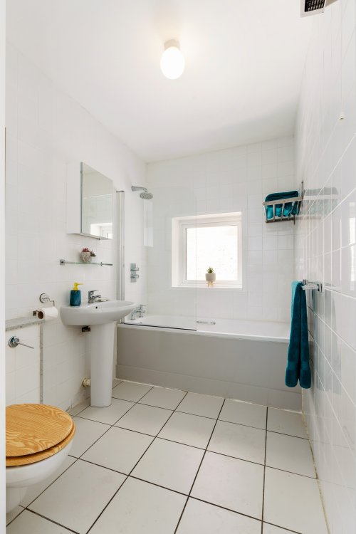 Bathroom 3.56m * 1.71m Tiled floor. Tiled walls. WC. Pedestal wash hand basin. Bath with shower. Mirrored medicine cabinet. Wall mounted heated towel rail and shelf. Hotpress with immersion.