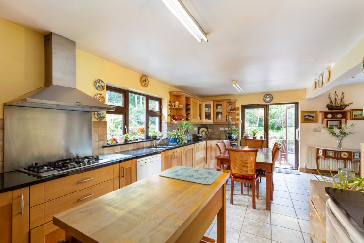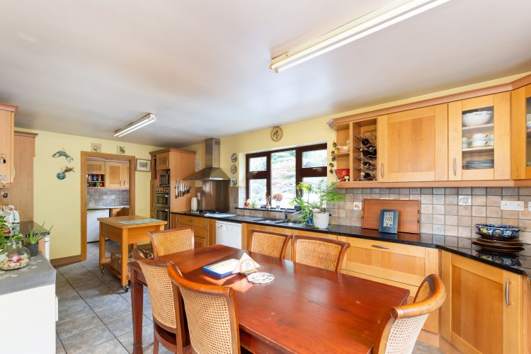 Kitchen/Dining The kitchen and dining area is a bright and welcoming space, designed with both functionality and style in mind. It features a superb range of custom-built maple wood units at floor and eye level, finished with elegant granite worktops and tiled surrounds. A double oven, extractor fan, and stainless-steel splashback are all included in the sale, while french doors open out onto the patio, creating an effortless link between indoor dining and outdoor living.