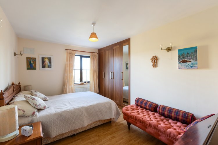 Master Bedroom The master bedroom is a bright and welcoming space, complete with fitted wardrobes, laminate flooring, and wall lighting. A large window frames picturesque views of the surrounding countryside, creating a peaceful retreat within the home.